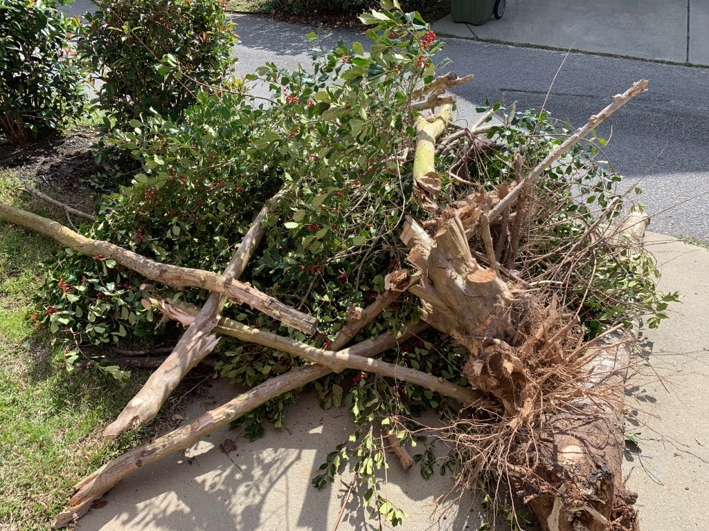 The other two trees were a crepe murdered (Google Crepe Murder, it’s not pretty.) Crepe Myrtle and an American Holly tree. Both of which were planted by the original builder of the home, WAY TO CLOSE TO THE HOUSE. Trees that can grow 30-40 feet tall should be at least fifteen feet away from the house. It is a recipe for disaster people. The holly’s roots were completely up against the foundation of the house and that could be dangerous. So D and I heave-hoed to the tree to the ground yesterday and the Crepe Myrtle was taken down after church today.