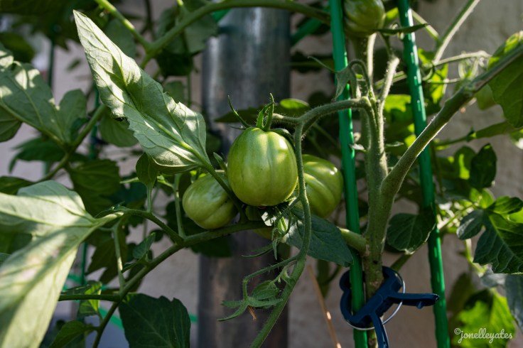 Germany is a cloudy country. Our yard is shady yard. My tomatoes are doing well, but they’re not ripening. So we moved them from the shady oak back yard to the front, praying that the on the brighter north side of the house, they would receive as much as light as they need to ripen. I may need to cut out some branches, but I’m not sure if this is a thing that I can do.